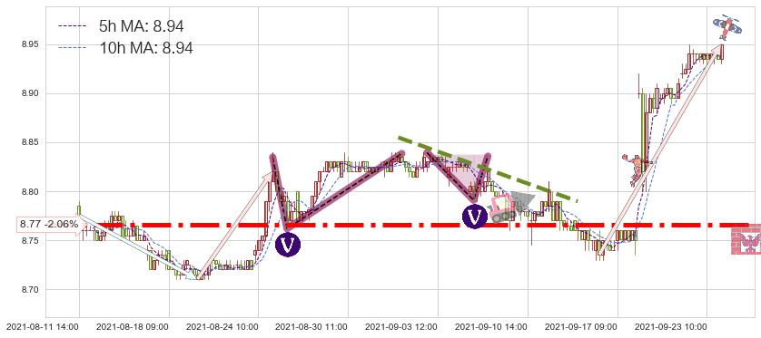 2021-09-09: 第一支撑位8.77有效抑制了下跌浪,成功阻止了价格的继续下跌。
