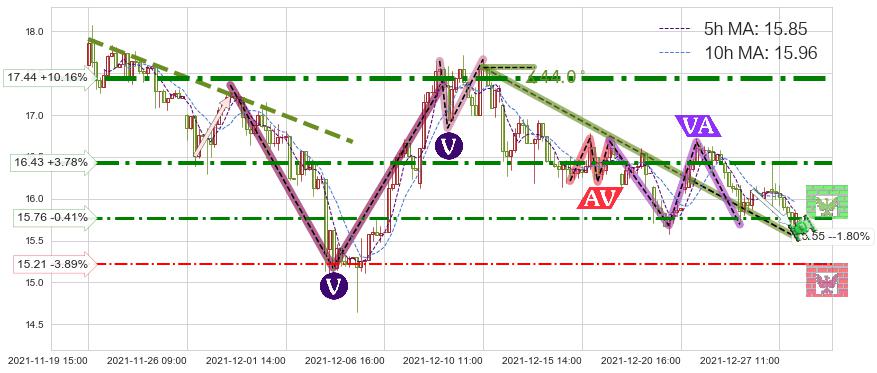 ♘ 阻力价格位15.76,可信任强度69.22%,距离最后交易2021-12-27 15:00形成的收盘价格15.83相差 -0.41%