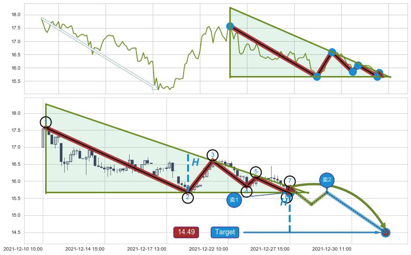 从2021-11-19 15:00至2021-12-03 16:00,共包含68个小时,阶段股价下跌-14.95%,阶段股价变动位移路程比: 1 : 3,下跌趋势角度: 43.4
