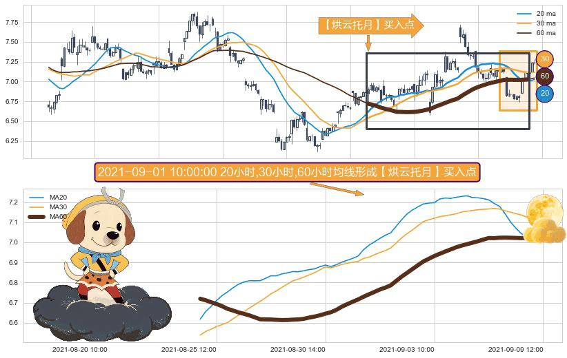 ⚀ 2021-08-25 09:00:00小时-2021-09-09 11:00:00小时显现 20小时-30小时-60小时均线 【烘云托月】买入点 看多信号,后市看涨,买入
