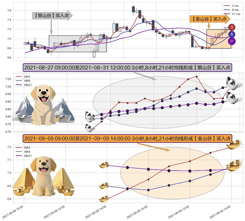 ⚀ 2021-09-09 10:00:00-小时至2021-09-09 14:00:00-小时显现 3小时-8小时-21小时均线 【金山谷】买入点 其再次确认了买入信号,可靠性更强,买入