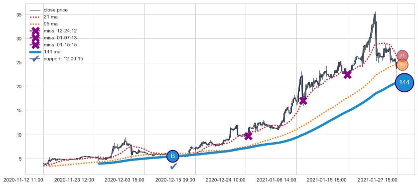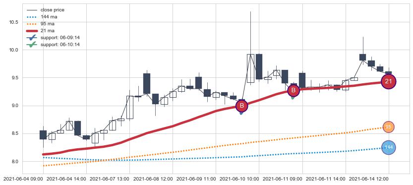 ⚀ 中期均线MA8上穿长期均线MA21形成的交叉是标准 黄金交叉