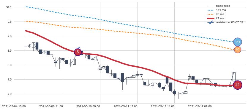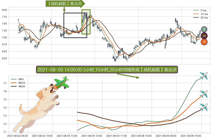 ⚀ 2021-08-03 13:00:00小时-2021-08-09 14:00:00小时显现 5小时-10小时-20小时均线 【战机起航】卖出点 看空信号,后市看跌,卖出