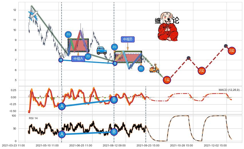 | 11 🅚:下跌两颗星 | 下跌三颗星 ➕ ☯️:缠论中枢点下降缠中枢B破位后距离1买距离较远,随后猜想后续持续下跌(趋势跟踪) ☞ 看空信号 ⇥ 【🅚线】交织【图形】⇥ 综合量化分数: 45 | > |