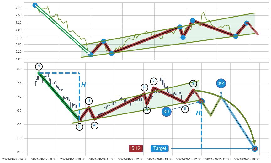 ➣ 支撑位【②④⑥⑧】波动逐渐走高,构成【旗形】上平行线