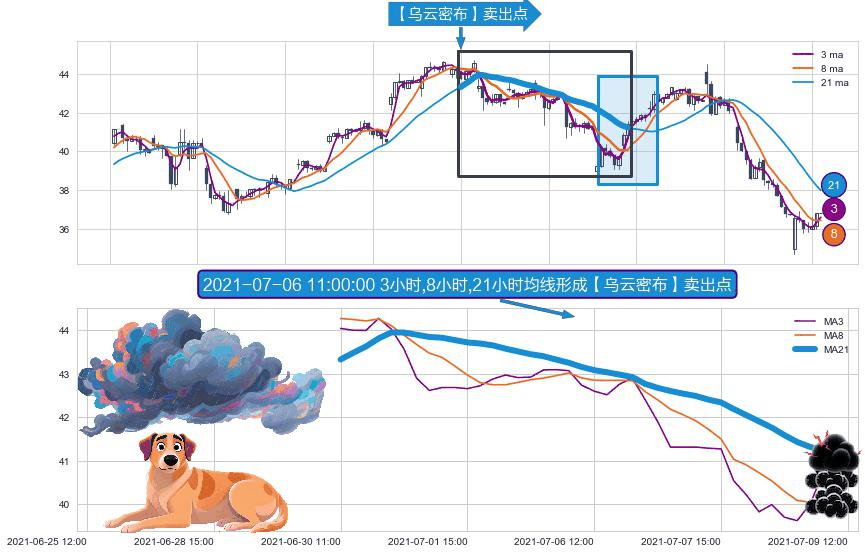 形态多维评估: ⚀ 2021-06-30 11:00:00小时-2021-07-09 10:00:00小时显现 3小时-8小时-21小时均线 【乌云密布】卖出点 看空信号,后市看跌,卖出