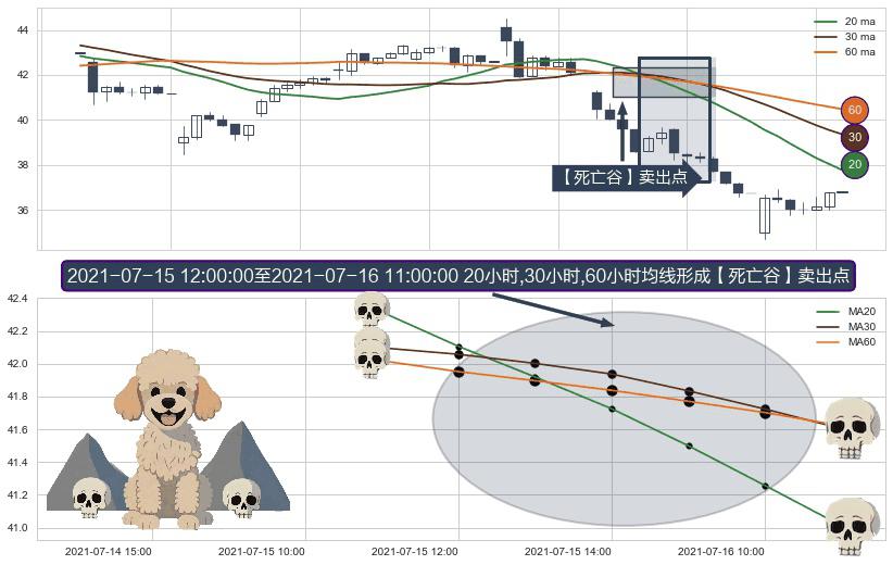 形态多维评估: ⚀ 2021-07-15 13:00:00-小时至2021-07-16 11:00:00-小时显现 20小时-30小时-60小时均线 【死亡谷】卖出点 看空信号,后市看跌,卖出