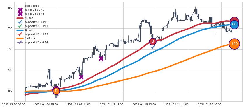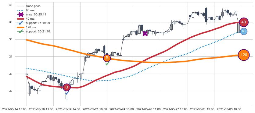 上涨趋势05-14 15:00-06-03 10:00,均线40, 120确认关键支撑2处