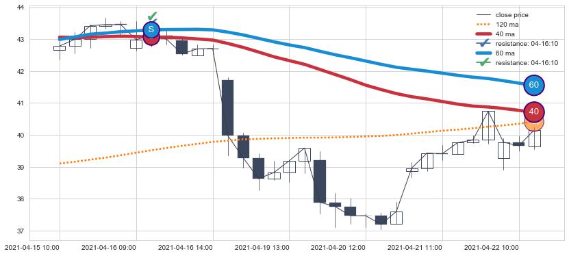 下跌趋势04-15 10:00-04-22 11:00,均线40, 60确认关键阻力1处