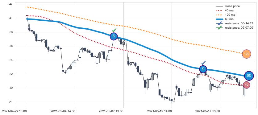 下跌趋势04-29 15:00-05-19 09:00,均线60确认关键阻力2处