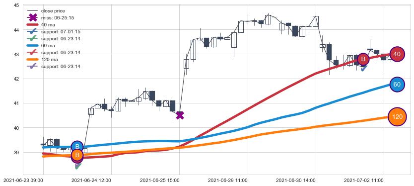 上涨趋势06-23 09:00-07-02 12:00,均线40, 60, 120确认关键支撑2处
