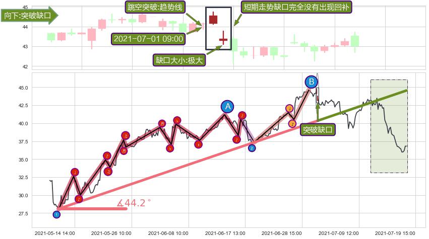 ✂️ 2021-05-12 14:00-2021-07-01 10:00上升趋势存在反转[风险],其原上升趋势的支撑位(44.54)已破位[强阻力信号],原上升趋势角度: 44.2˚