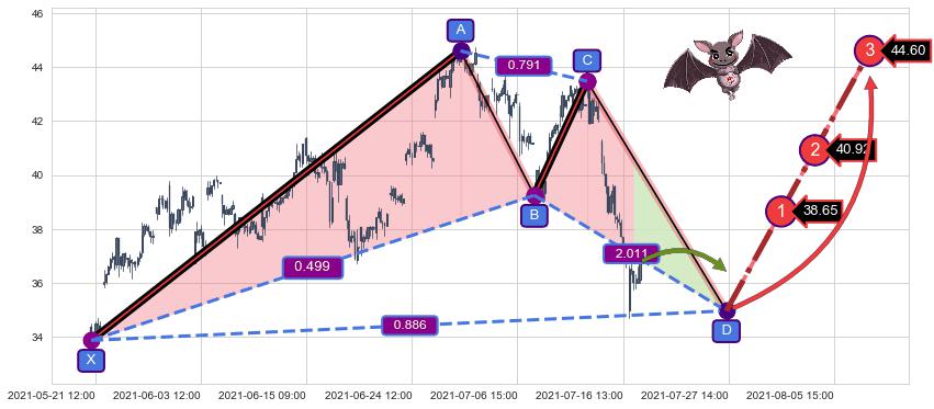 ➢ 接近预测D点位置, 随时警戒看涨【蝙蝠】形态反转启动