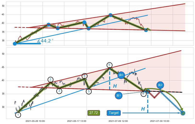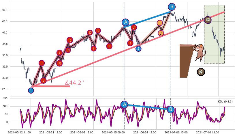 从2021-05-12 14:00至2021-07-01 10:00,共包含230个小时,阶段股价上涨44.65%,阶段股价变动位移路程比: 1 : 5,上涨趋势角度: 44.2