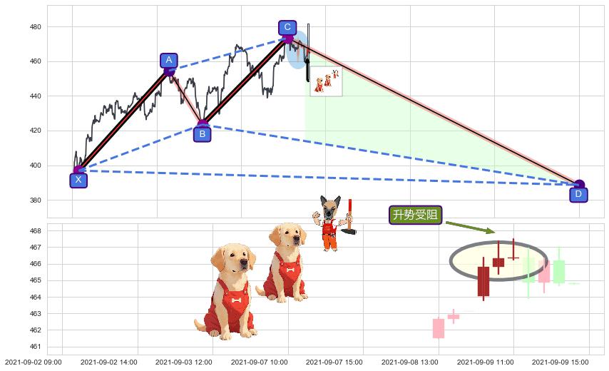 ➣ D点拟合预测价格388.64,距离最后交易收盘价格464.77相差 -16.38%