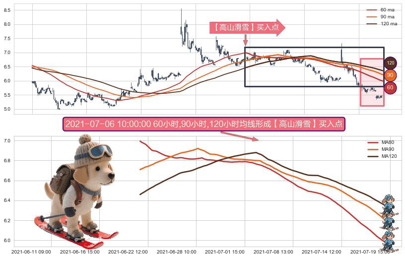 形态多维评估: ⚀ 2021-06-21 15:00:00小时-2021-07-19 15:00:00小时显现 60小时-90小时-120小时均线 【高山滑雪】买入点 看多信号,后市看涨,买入