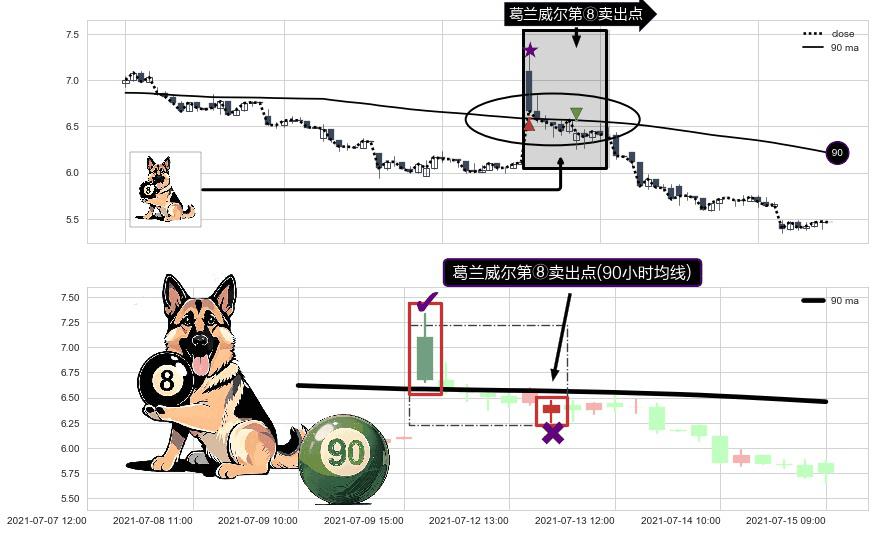 形态多维评估: ⚀ 2021-07-13 09:00:00-小时显现 葛兰威尔均线 90小时均线 第⑧卖出点 下降趋势的中继信号,后市看跌,卖出信号