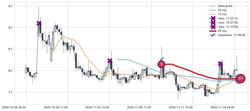 下跌趋势10-26 09:00-11-16 10:00,均线65确认关键阻力1处