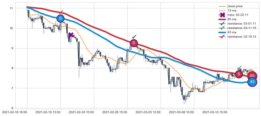 下跌趋势02-16 16:00-03-12 13:00,均线65, 45确认关键阻力3处