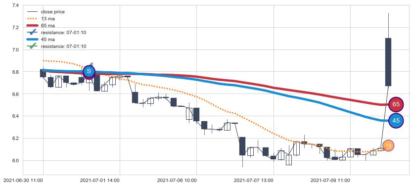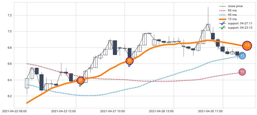 上涨趋势04-22 09:00-04-30 15:00,均线13确认关键支撑2处