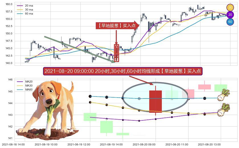 ⚀ 2021-08-20 09:00:00小时显现 20小时-30小时-60小时均线 【旱地拔葱】买入点 看多信号,后市看涨,买入