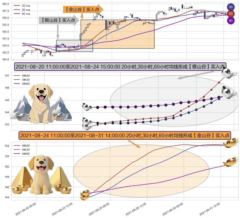 ⚃ 2021-08-24 12:00:00-小时至2021-08-31 14:00:00-小时显现 20小时-30小时-60小时均线 【金山谷】买入点 其再次确认了买入信号,可靠性更强,买入