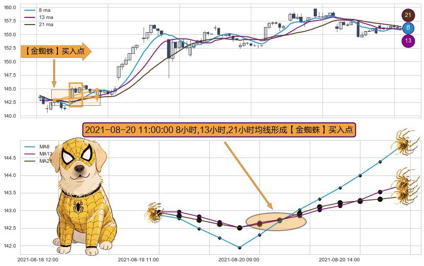 ⚀ 2021-08-20 11:00:00小时显现 8小时-13小时-21小时均线 【金蜘蛛】买入点 看多信号,后市看涨,买入