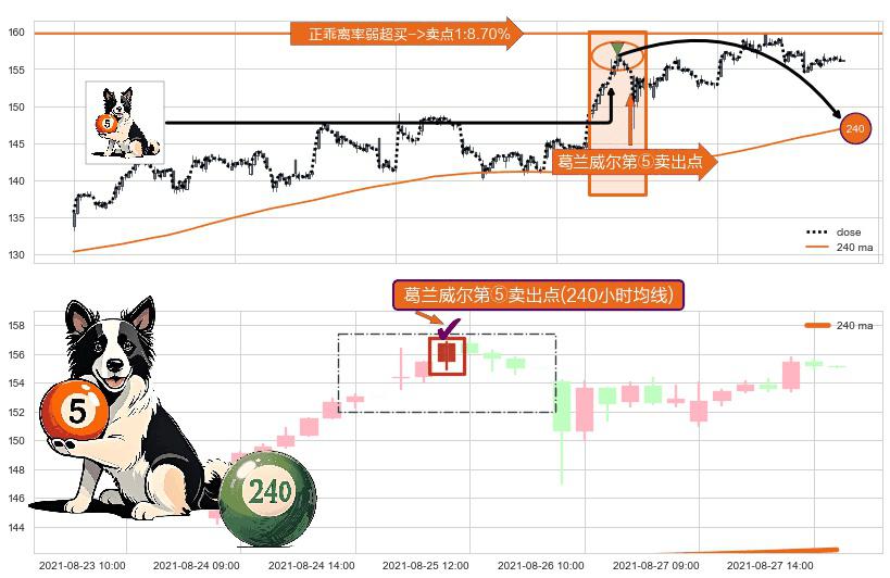 ⚀ 2021-08-25 11:00:00-小时显现 葛兰威尔均线 240小时均线 第⑤卖出点 上升趋势均值回复的短线回落信号,后市看跌,卖出信号