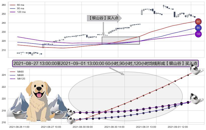 形态多维评估: ⚀ 2021-08-27 14:00:00-小时至2021-09-01 13:00:00-小时显现 60小时-90小时-120小时均线 【银山谷】买入点 看多信号,后市看涨,买入