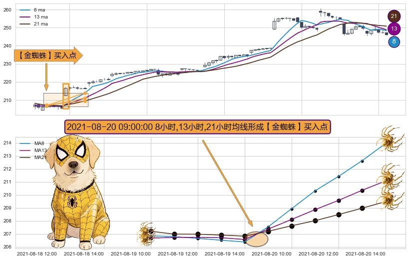 形态多维评估: ⚀ 2021-08-20 09:00:00小时显现 8小时-13小时-21小时均线 【金蜘蛛】买入点 看多信号,后市看涨,买入