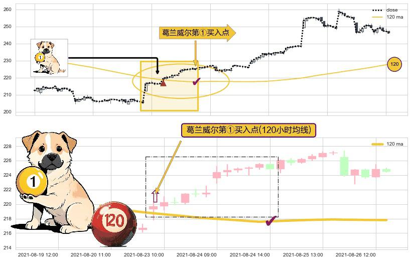 形态多维评估: ⚀ 2021-08-23 09:00:00-小时显现 葛兰威尔均线 120小时均线 第买①入点 走势反转见底信号,后市看涨,买进信号