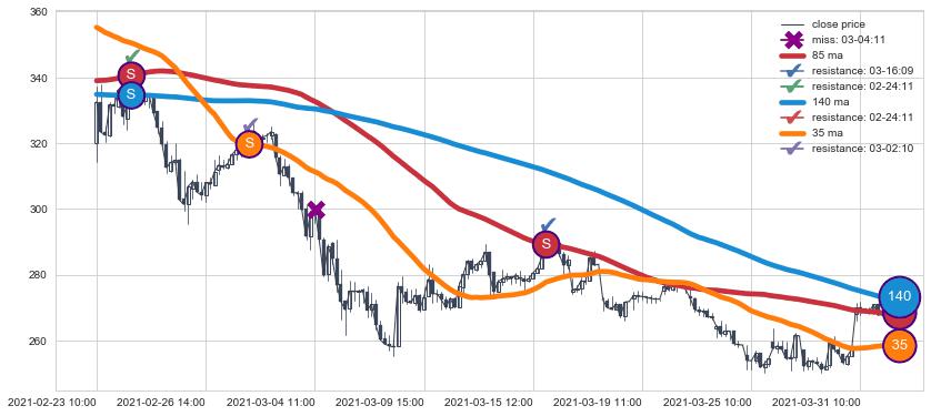 下跌趋势02-23 10:00-03-31 15:00,均线35, 140, 85确认关键阻力3处