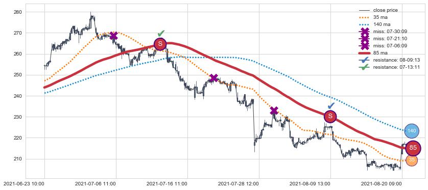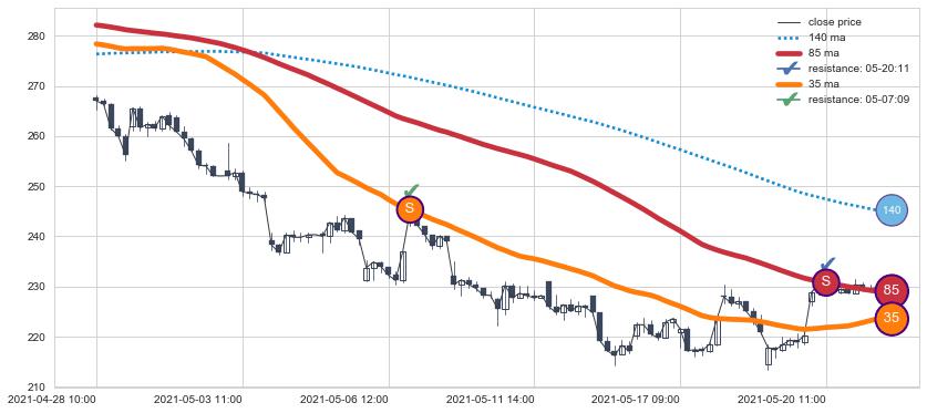 下跌趋势04-28 10:00-05-21 12:00,均线35, 85确认关键阻力2处