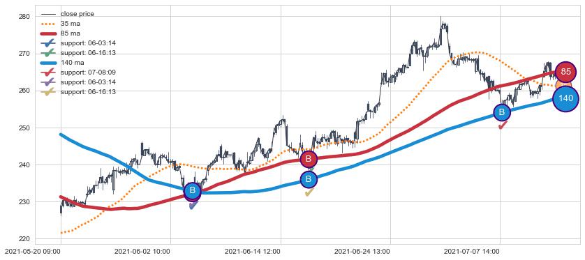 上涨趋势05-20 09:00-07-13 14:00,均线140, 85确认关键支撑3处