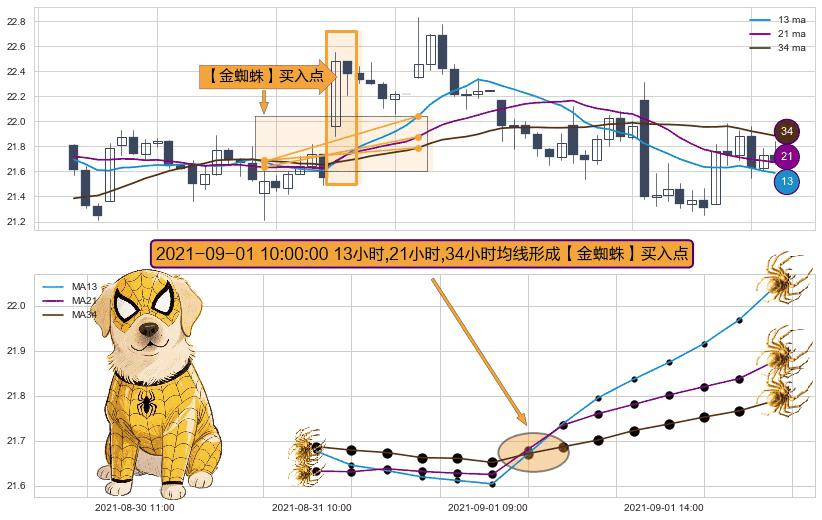 形态多维评估: ⚀ 2021-09-01 10:00:00小时显现 13小时-21小时-34小时均线 【金蜘蛛】买入点 看多信号,后市看涨,买入