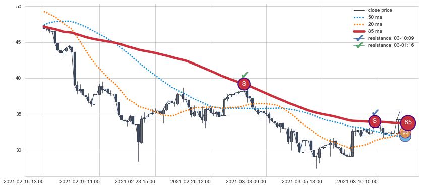 下跌趋势02-16 13:00-03-11 10:00,均线85确认关键阻力2处