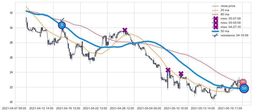下跌趋势04-07 09:00-05-19 11:00,均线50确认关键阻力1处