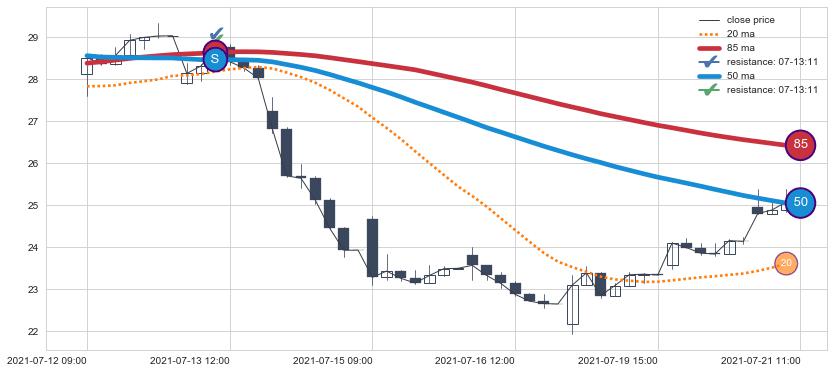 下跌趋势07-12 09:00-07-21 11:00,均线50, 85确认关键阻力1处