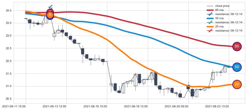 下跌趋势08-11 15:00-08-23 14:00,均线50, 20, 85确认关键阻力1处