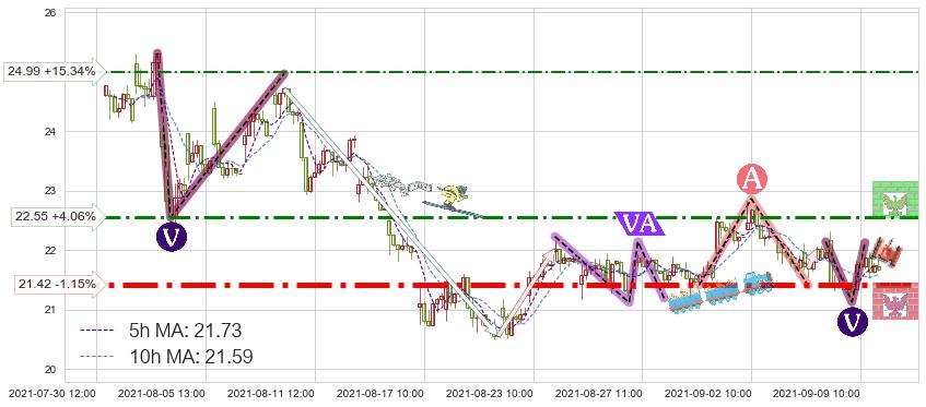 ♘ 阻力价格位22.55,可信任强度67.35%,距离最后交易2021-09-09 14:00形成的收盘价格21.67相差 +4.06%