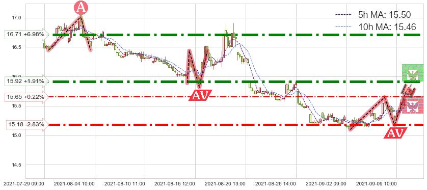 ♘ 支撑价格位15.65,可信任强度46.50%,距离最后交易2021-09-09 14:00形成的收盘价格15.62相差 +0.22%