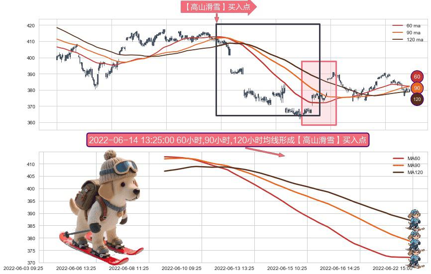 形态多维评估: ⚀ 2022-06-08 14:25:00小时-2022-06-22 14:25:00小时显现 60小时-90小时-120小时均线 【高山滑雪】买入点 看多信号,后市看涨,买入