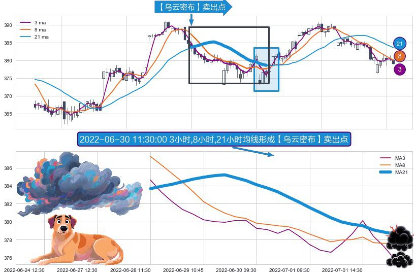 形态多维评估: ⚀ 2022-06-28 11:30:00小时-2022-07-05 11:30:00小时显现 3小时-8小时-21小时均线 【乌云密布】卖出点 看空信号,后市看跌,卖出