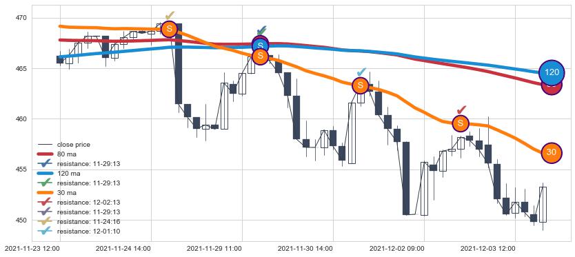 下跌趋势11-23 12:00-12-03 15:00,均线80, 120, 30确认关键阻力4处