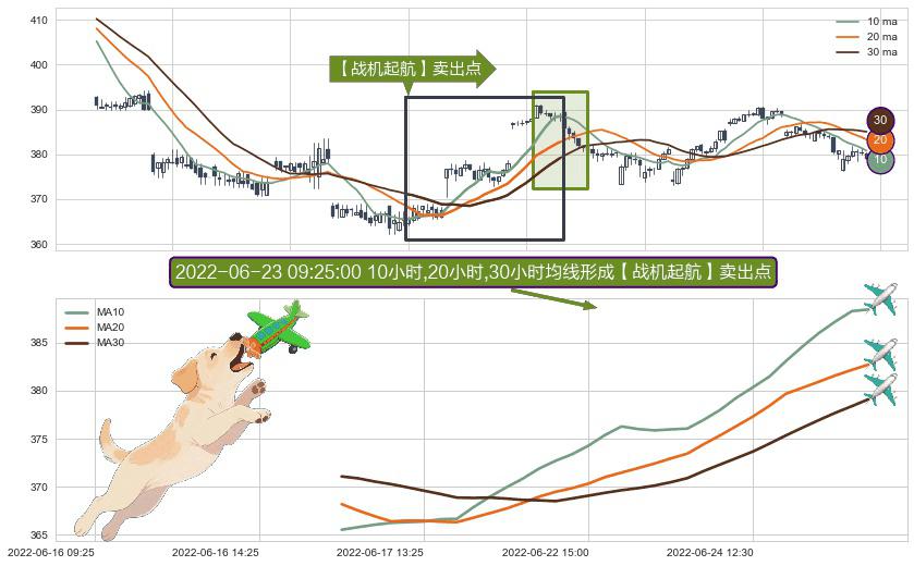 形态多维评估: ⚀ 2022-06-17 11:00:00小时-2022-06-27 14:30:00小时显现 10小时-20小时-30小时均线 【战机起航】卖出点 看空信号,后市看跌,卖出