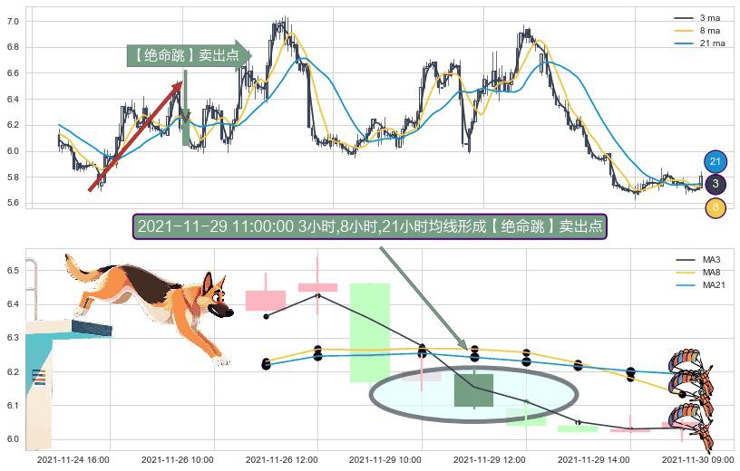 ⚀ 2021-11-29 11:00:00小时显现 3小时-8小时-21小时均线 【绝命跳】卖出点 看空信号,后市看跌,卖出