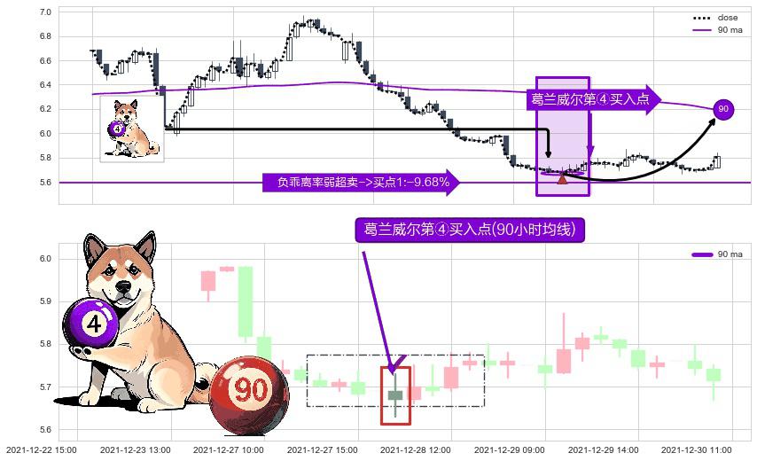 ⚀ 2021-12-28 09:00:00-小时显现 葛兰威尔均线 90小时均线 第④买入点 下降趋势均值回复的短线反弹信号,后市看涨,买进信号