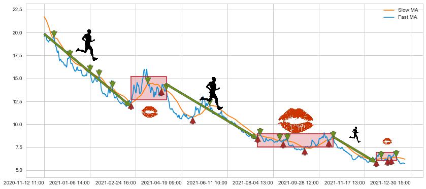 ⚀ 卖点向下突破均线后,价格走势很纠结,不断在均线周围试探,有再次上探突破均线的可能