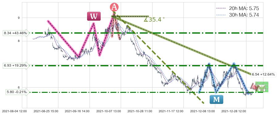 ♘ 阻力价格位5.80,可信任强度58.70%,距离最后交易2021-12-30 15:00形成的收盘价格5.81相差 -0.21%