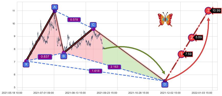 ➣ 未完成【蝴蝶】形态起点X: 05-24:09, 已到达C点: 08-25:10, 预测最终D点: 11-16:12, 共866交易小时